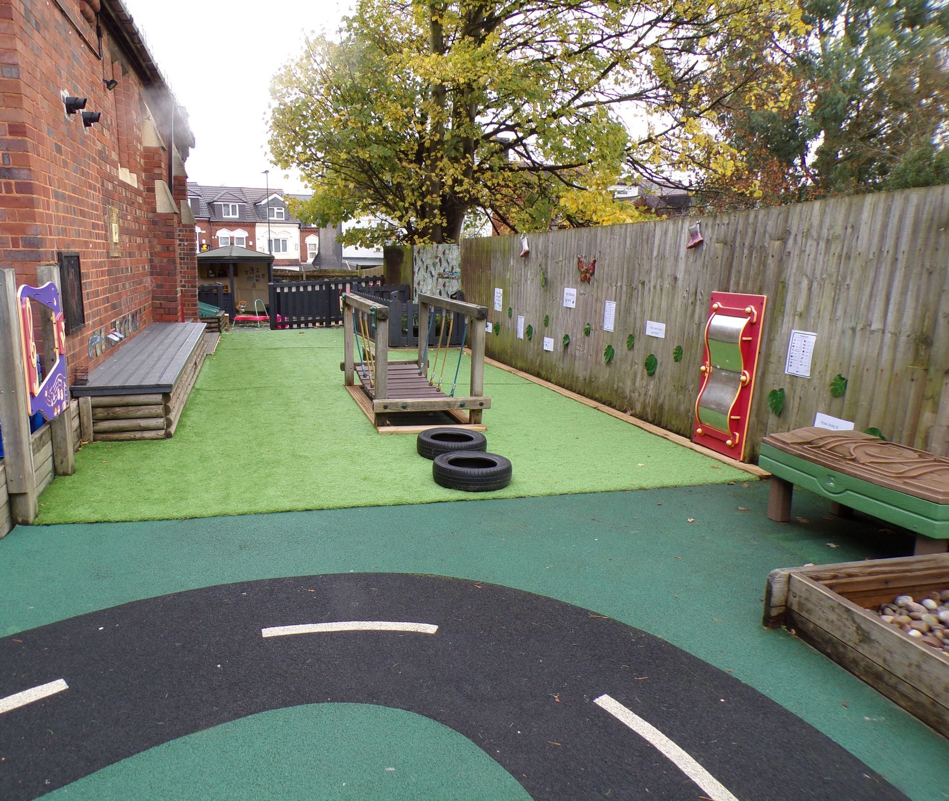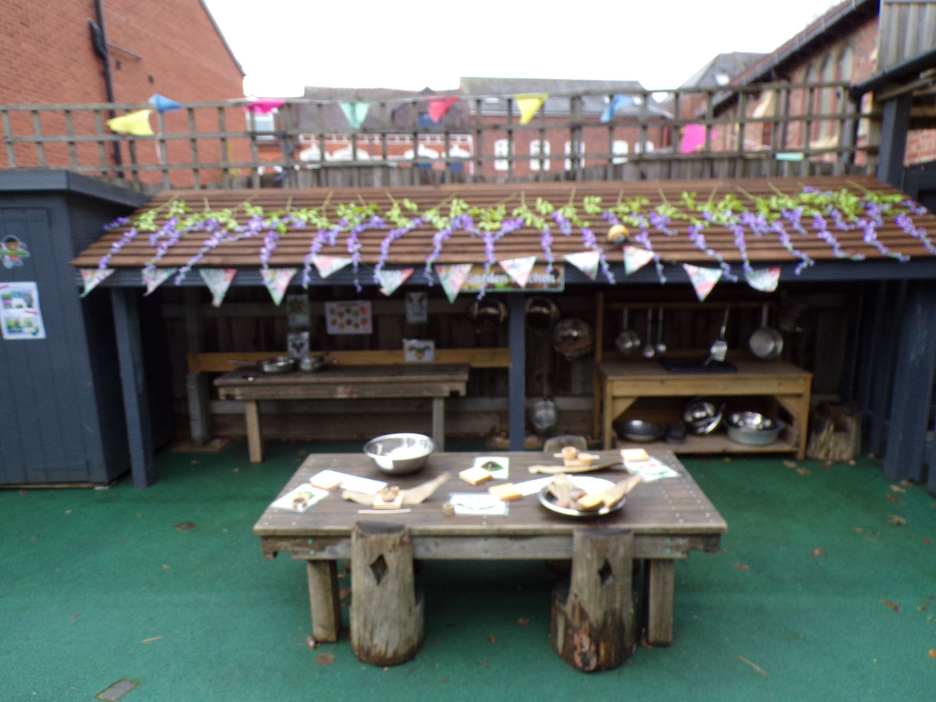 The large garden area boasts a covered gazebo, which can be used for learning, or simply to be creative by drawing or chalking.