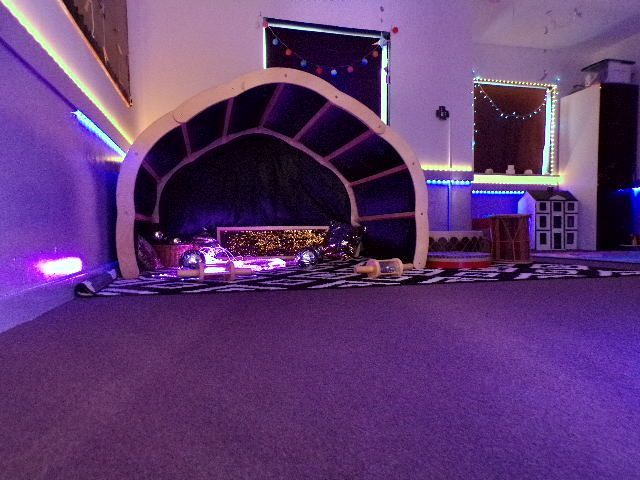 This space can be darkened to allow the glow of coloured lighting to transcend around the room.